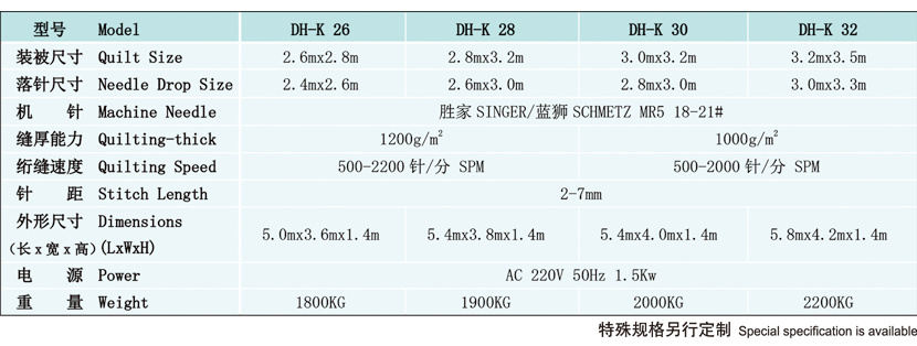 DH-K系列電腦高速絎縫機(jī)是制作各種床被,墊罩的縫制設(shè)備,縫制效率快、花樣美觀、圖形精細(xì)。該產(chǎn)品總體布局合理,整體性能,并始終堅(jiān)持吸收國(guó)內(nèi)外先進(jìn)技術(shù)與創(chuàng)新相結(jié)合的指導(dǎo)思想,以高起點(diǎn)、上檔次、創(chuàng)國(guó)內(nèi)先進(jìn)水平為目標(biāo),精心設(shè)計(jì),反復(fù)改進(jìn),目前已達(dá)到同類(lèi)產(chǎn)品的領(lǐng)先水平。