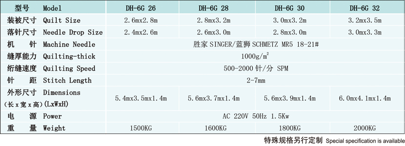 DH-6G系列長(zhǎng)臂電腦高速絎縫機(jī)是制作各種床被、墊罩的縫制設(shè)備,縫制效率快、花樣美觀、圖形精細(xì)。該產(chǎn)品結(jié)構(gòu)新穎,采用懸掛式結(jié)構(gòu),緊湊輕巧,整體性能穩(wěn)定優(yōu)良,滿足產(chǎn)品設(shè)計(jì)規(guī)范要求,是同檔次產(chǎn)品中的精品。